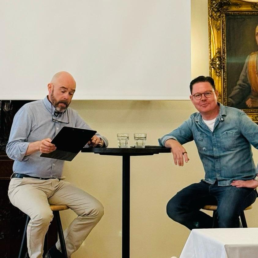 Vi börjar kl. 17 i festsalen och precis som AW-träffen med Patrick Henriksen fortsätter vi efter intervjun i baren på första våningen.